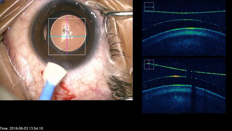 廈門大學(xué)附屬廈門眼科中心總院長黎曉新教授已使用該術(shù)中OCT完成了不少眼底手術(shù),她以黃斑手術(shù)為例介紹說,作為視網(wǎng)膜重要的結(jié)構(gòu),黃斑手術(shù)的精密度要求非常高。在黃斑裂孔手術(shù)中,術(shù)中OCT可以實(shí)時(shí)監(jiān)控整個(gè)過程,核心步驟完成,可以立即掃描,觀察OCT來評估手術(shù)作用,預(yù)測術(shù)后恢復(fù),對于手術(shù)起到重大的保障和提高,使得手術(shù)質(zhì)量得到跨越式地提升。