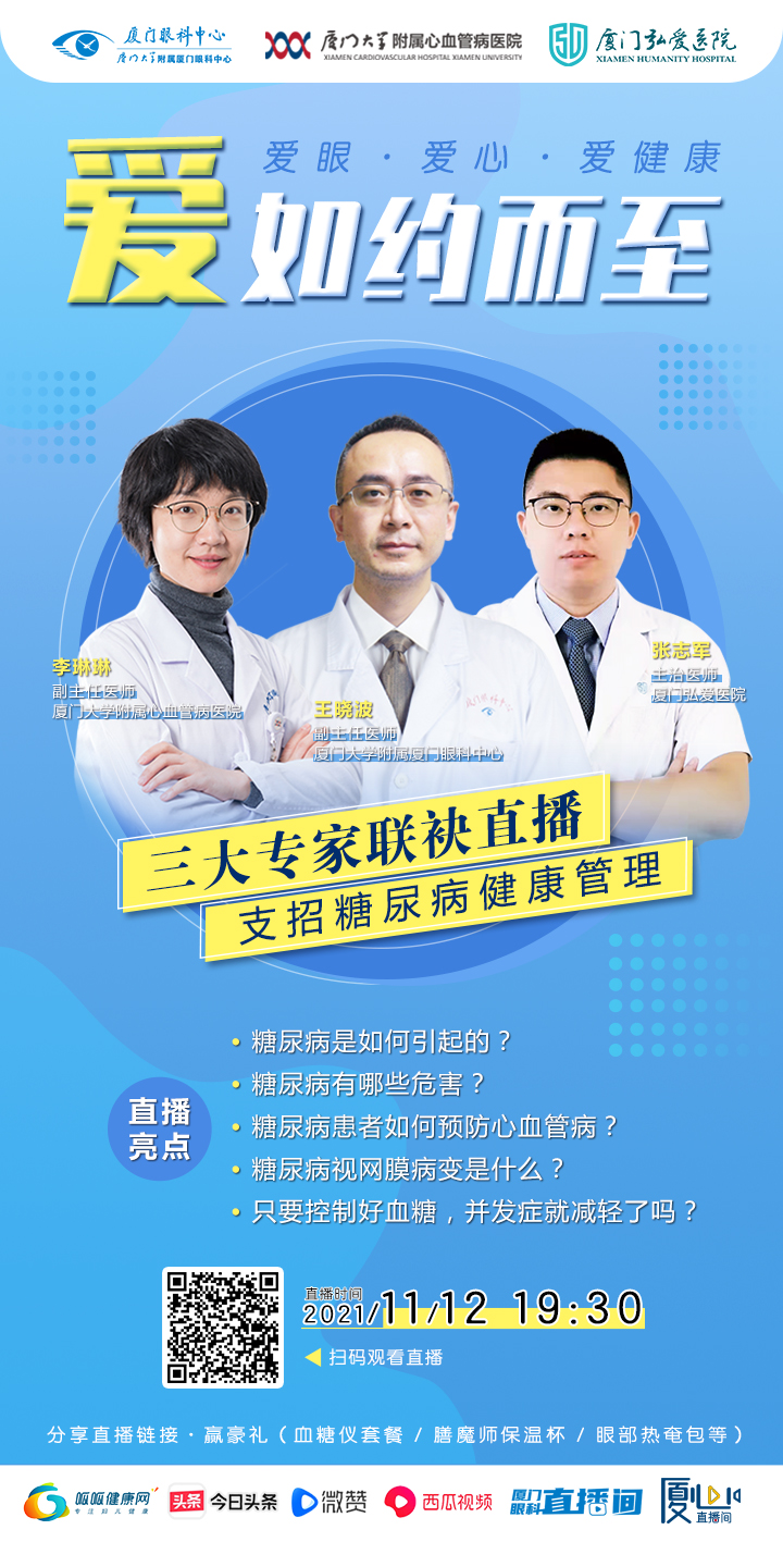 11月12日(周五)晚19:30,廈門大學(xué)附屬?gòu)B門眼科中心攜手廈門大學(xué)附屬心血管病醫(yī)院、廈門弘愛(ài)醫(yī)院共同開展聯(lián)合國(guó)糖尿病日大型公益直播活動(dòng)。