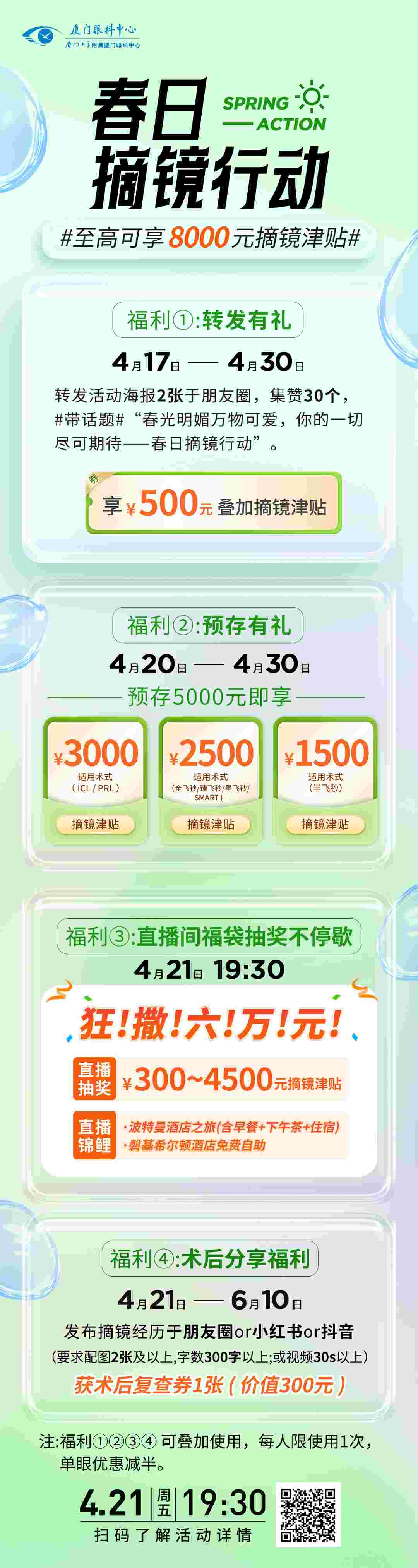 4月20日至4月30日,預(yù)存5000元,ICL、PRL享3000元摘鏡津貼;全飛秒/臻飛秒/星飛秒/SMART享2500元摘鏡津貼;半飛秒享1500元摘鏡津貼。