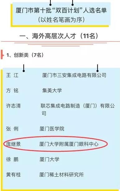 2018年1月25日,廈門市第十批引進高層次人才“雙百計劃”人選名單的公告及名單正式公布!歷經(jīng)半年時間申報、初審、網(wǎng)絡評審、現(xiàn)場答辯、市高層次人才引進專項小組會議研究和公示等層層篩選,最終世界眼遺傳病基因治療專家、華廈