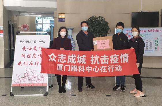 只見,數(shù)位志愿者將一箱箱護目鏡送到街道代表手中,一旁的紅色橫幅寫著“眾志成城,抗擊疫情,廈門眼科中心在行動”的醒目大字。連日來,這樣的愛心場景出現(xiàn)在廈門各街道,這是來自廈門大學附屬廈門眼科中心的愛心捐贈。