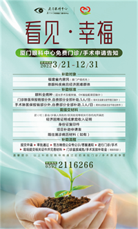 眼睛是心靈之窗,眼健康是國民健康的重要組成部分,也是反映人民群眾健康和幸福指標(biāo)的一面鏡子。為深化落實“愛心廈門”行動及內(nèi)涵,提升人民群眾的獲得感、幸福感、安全感,滿足普遍、多樣的眼健康需求,2022年3月21日至12月31日,廈門眼科中心暖心啟動2022年“看見幸福”眼健康愛心公益項目,聚焦弱勢群體及重點眼病的困難救治,凡符合條件的患者均可申請專項愛心公益補(bǔ)助。